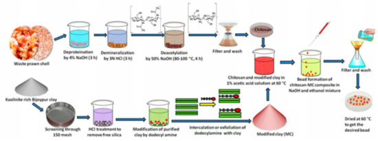Biopolymers (polynucleotides, nucleotides, polypeptides, polysaccharides, and proteins, etc.) are green and biocompatible materials useful in the synthesis of clay NCs with improved properties like functionality and reactivity. The improved properties offered by biopolymers allowed the application of the clay-biopolymers nanocomposites in different fields like packaging materials, tissue engineering, drug delivery, controlled pesticide, and electrochemical sensing. Chitosan is an example of biopolymers extracted from crustacean seafood wastes [29] and composed of units of N-acetylglucosamine and glucosamine. This biopolymer was used for the synthesis of clay nanocomposite useful for the removal of pollutants from water [30]. The synthesis of clay-chitosan nanocomposite was described in another work [31] as shown in Figure 1.