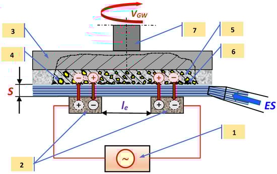 The scheme of the electrochemical dressing of grinding wheel using alternating current (ECDGW-AC): 1—alternating current power supply, 2—carbon electrodes, 3—grinding wheel frame, 4—abrasive grains, 5—metal bond, 6—gumming up products of cutting surface of superhard grinding wheel (CSGW), 7—spindle; VGW—speed of grinding wheel, S—inter-electrode gap, le—distance between electrodes, ES—electrolyte solution of specially selected chemical compounds.