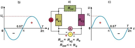 (a) Equivalent electric circuit diagram of the dressing process using ECDGW-AC method; (b,c) Course of current variation on electrodes; Re—resistance of electrolyte, RGW—resistance of grinding wheel.