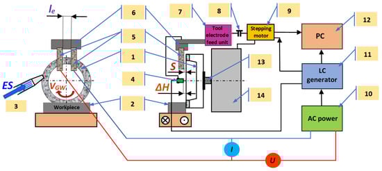 The scheme of a stand for grinding wheels dressing using the ECDGW-AC method: 1—grinding wheel, 2—workpiece, 3—electrolyte supplying nozzle, 4—inductive sensor, 5—tool-electrode, 6—electrode holder, 7—tool-electrode feed unit, 8—guide-screw, 9—stepping motor, 10—AC power unit, 11—LC generator, 12—computer, 13—spindle, 14—headstock, le—distance between electrodes, ES—electrolyte solution of specially selected chemical compounds, S—inter-electrode gap, ΔH—the thickness of the grinding wheel layer removed in the ECDGW-AC process.