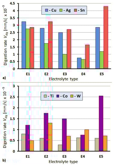 The comparative assessment of the effect of individual electrolytes on grinding wheel components dissolution rate is depicted in Figure 6. Their analysis indicates that the chemical composition of electrolyte solutions and the applied protective agent (present in the electrolytes E3 and E4) substantially influence the rate of the grinding wheel components digestion. It is particularly evident in the case of Cu and Sn, which are components of the grinding wheel metal bond, and Co, which binds sintered carbides loading on the CSGW. The ratio of the highest to the lowest rate of these metals digestion in selected electrolytes amounted to almost 3, and the rate was the highest for the E5 electrolyte, followed by the rates of dissolution in E1, E2, E3, and E4. The studies proved that appropriate electrolytes provide digestion of all the metals present either in grinding wheel metal bond (Ag, Cu, Sn) or in products loading on the CSGW (Co, W), that enables selection of the best electrolyte solution, optimal for the ECDGW-AC process actual conditions. The only exception is Ti, which undergoes passivation and forms a layer of oxides on the CSGW. The dissolution of all components of metal bond, grinding wheel and Co, which binds the sintered carbides (WC and TiC) results in the simultaneous removal of Ti oxides from the CSGW within the ECDGW-AC process. This fact was confirmed by X-ray studies on the EDGW–AC process products resulting from electrochemical reactions. The executed chrono-volt-amperometric studies and the analysis of their results revealed that the minimum current density enabling digestion of all the metals being components of the grinding wheel was equal to about 0.3 Acm−2 (Figure 7).