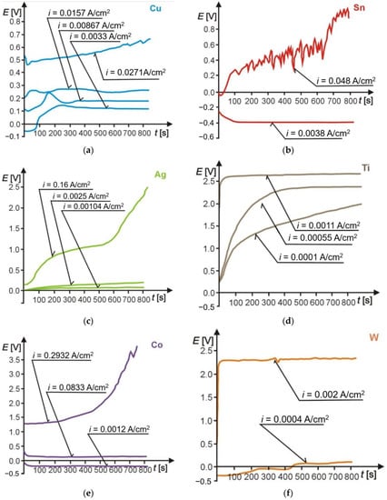 The chrono-volt-amperometric plots of the grinding wheel components: (a) Copper; (b) Tin; (c) Silver; (d) Titanium; (e) Cobalt; (f) Tungsten.