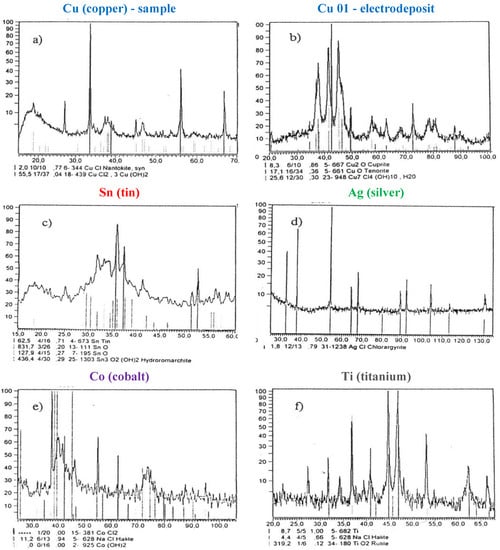 X-ray diffraction patterns of the grinding wheel erosion products: (a) Copper—the sample; (b) Copper—electrodeposit; (c) Tin; (d) Silver; (e) Cobalt; (f) Titanium; Electrolyte solution E3.