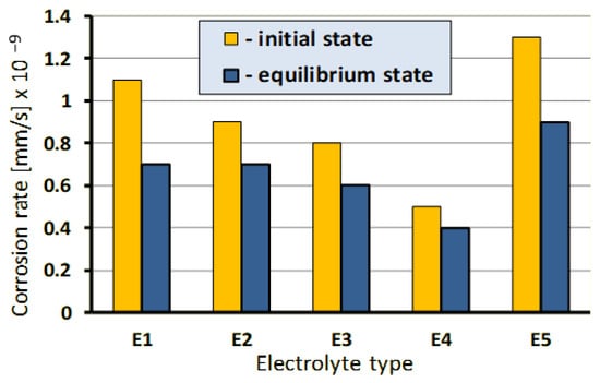 The investigations concern the determination of electrochemical equilibrium conditions and rates of metal digestion (being components of both metal bond and products loading on the CSGW) in selected solutions of electrolytes, the estimation of minimal density of these metals dissolution current, and an assessment of the corrosive effect of these electrolytes on constructional units of the grinder. The research was based on the digestion of samples of metals making up the metal bond and products loading on the CSGW in 5 different electrolyte solutions E1–E5 (containing up to 5% of the following compounds: NaCl, KNO2, KNO3, Na2CO3, CaCO3, and a protective agent) and chrono-volt-amperometric measurements. The dissolution of Cu, Sn and Ag, i.e., the components of metal bond of a (S3020 175 × 6 × 3 × 50 D125/100 M100) grinding wheel, as well as Co, Ti and W, which are components of products loading on the CSGW, formed during sintered carbides (type S20S) grinding, was within the scope of the studies. The usefulness of the selected electrolytes was estimated on the basis of the rates of individual metal digestion. The value of the current corresponding to the equilibrium state between the reactions of anodic metal digestion and cathodic reduction of the electrolyte solution components was the factor characterizing the metal dissolution rate in the electrolytes. The values of equilibrium potentials and digestion current were determined based on cyclic volt-amperograms and Tafel’s relationship plots.