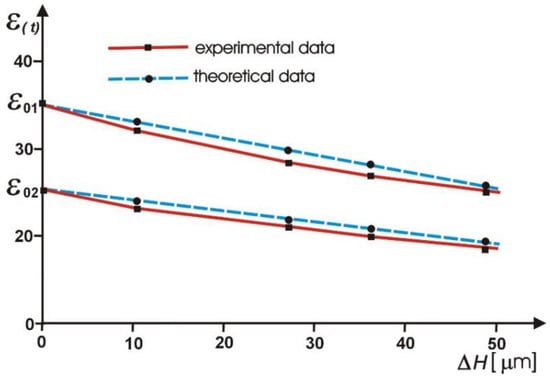 The comparison of experimental and theoretical values of the coefficient of reduction in deviation of the run—out of a grinding wheel in the ECDGW-AC dressing process. They refer to dressing of a diamond grinding wheel of the known initial value of face run-out εO. The dressing process was carried out with the electrode as the stationary tool. In the course of the dressing, the face run-out ε(t) and the thickness of the removed layer of the grinding wheel (ΔH) were determined.