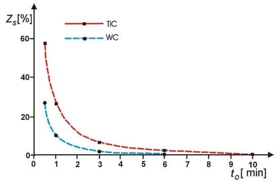 An analysis of the changes in this parameter (Figure 12) confirms the effectiveness of the ECDGW-AC process in forming the CSGW, particularly in restoring the cutting ability of the grinding wheel. Following the dressing by ECDGW-AC method, a change in this parameter is observed consisting of the histogram shift of distribution of TN into a zone of greater dimensions of the chip. This attests to an increase in the proportion of the cutting edges actively participating in chip formation and a limitation of the number of apparently active cutting edges. The loading of grinding products on the CSGW is one of the forms of superhard grinding wheels wear. An X-ray method of the modified external standard, developed by the author, was used in order to assess the degree of loading the CSGW with grinding products. Some examples of investigation results, confirming the effectiveness of the ECDGW-AC process for the removal of products loading on the CSGW of the (S3020 175 × 6 × 3 × 50 D125/100 M100) grinding wheel, glazed in test of sintered carbides (S20S) grinding, are shown in Figure 13.