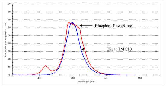 The light curing protocols selected in this study were based upon the manufacturers’ instructions for the tested composite resins. Although the manufacturer’s irradiance value for the Bluephase PowerCure (3 s protocol) is 3050 mW/cm2, our measured value was around 2400 mW/cm2, which may be partially explained by the difference in measuring devices and the variance in diameter among the sensor and light curing tip. This is in harmony with the research by Shimokawa, et al. [37], who reported differences between the measured irradiance values of light curing units and those provided by the manufacturers. In addition to the irradiance value, it is essential to identify the emission spectrum of the light curing unit. In the present study, the Elipar TM S10 (1600 mW/cm2) emitted single-peak blue light, whereas the Bluephase PowerCure emitted two emission peaks of light, blue and violet (Figure 1).