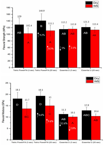 Bar graph showing means of flexural strength (MPa) and flexural modulus (GPa) with standard deviations (SD) of tested composite resins (WS refers to one month water storage at 37 °C). Non-statistically relevant variations (p > 0.05) between the materials are represented by the same letters within the bars. Differences between curing protocols presented as %.