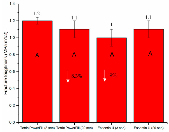 Bar graph showing mean fracture toughness (KIC) with standard deviations (SDs) of investigated composite resins. Non-statistically relevant variations (p > 0.05) between the materials are represented by the same letters within the bars. Differences between curing protocols presented as %.