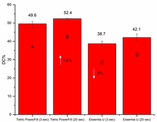 The composite resins must obtain adequate energy at the required wavelengths to achieve the optimal physical and surface properties [20]. Although there was a chemical difference between the two composite resins, both developed acceptable DC% (monitored for 15 min), confirming that when the curing protocol suggested by the manufacturers was used, adequate light was able to get to the bottom of the composite resin (Figure 4). On the other hand, CQ-based composite resin (Essentia U) light cured using the 3-s protocol showed reduced DC% values (38.7) due to decreased polymerization growth in the initial phases of the polymerization reaction. In other words, high intensity values can create extra radicals easily, and this can lead to more and earlier bi-radical polymer chain termination, resulting in regions where the DC% of the composite resin is lower [21]. This is in consistent with the work of Palin, et al. [22], who reported a low rate of polymerization and DC% of conventional CQ-based composite resin when cured using a fast high-intensity curing protocol. It is crucial to highlight that the rate of polymerization is affected not only by the energy dose, but also by the reactivity of the photoinitiator components, for instance the quantum yield, and additional causes [12].