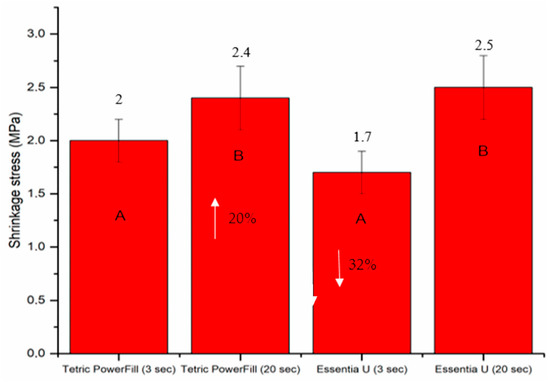 Bar graph showing means of the shrinkage stress (MPa) and standard deviations (SDs) of the investigated composite resins. Non-statistically relevant variations (p > 0.05) between the materials are represented by the same letters within the bars. Differences between curing protocols presented as %.