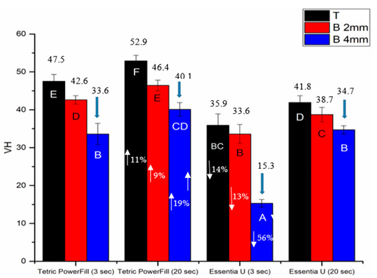 Bar graph showing means of surface microhardness (VH) at the top (T) and bottom (B) of 2- and 4-mm-thick specimens. Arrows above the columns indicate that the VH of these groups dropped below 80% of the top surface values. Non-statistically relevant variations (p > 0.05) between the materials are represented by the same letters within the bars. Differences between curing protocols at various thicknesses presented as %.