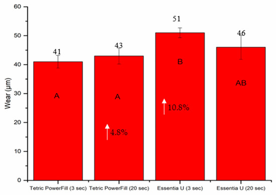 Bar graph showing means of wear depth (µm) and surface roughness (µm) with standard deviations (SDs) of investigated composite resins. Non-statistically relevant variations (p > 0.05) between the materials are represented by the same letters within the bars. Differences between curing protocols presented as %.