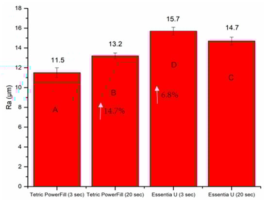 The mean values for wear depth and surface roughness (Ra) recorded for each composite resin after 15,000 chewing simulation cycles are shown in Figure 7. Regardless of the material and light curing protocol used, Ra after the wearing test was significantly higher (ranging between 11.5–15.7 µm) than before wearing (ranging between 0.2–0.4 µm) (p < 0.05). Essentia U with the 3-s light curing protocol presented the highest values (51 µm) of wear depth and Ra (15.7 µm) (p < 0.05) compared with all the tested groups (Figure 7).