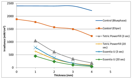 The irradiance (mW/cm2) of the light curing units at various thicknesses relative to the sensor through composite resins.