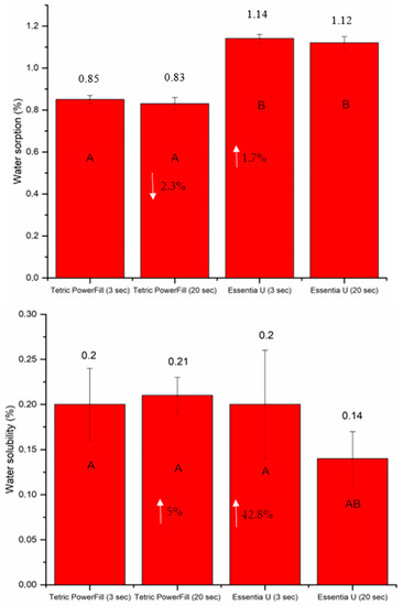 Bar graph showing means of water sorption and solubility with standard deviations (SDs) of tested composite resins during 30 days of storage in water at 37 °C. Non-statistically relevant variations (p > 0.05) between the materials are represented by the same letters within the bars. Differences between curing protocols presented as %.