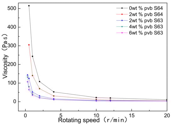 Figure 2. Viscosity changes of Al(OH)3/carbon/ethanol slurries with different PVB additions.