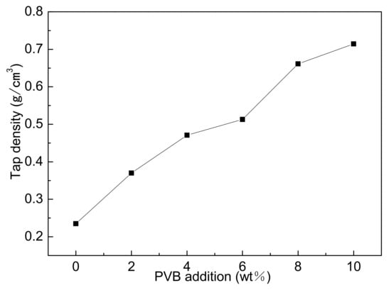Figure 3 showed the tap densities of different samples mixed by three-roll with different PVB additions. It could be seen that the tap densities gradually increased with the increase in0 PVB content. PVB covering the surface of Al(OH)3 and carbon black particles increased the compatibility between the powder particles during the mixing, thus narrowing the distance between particles and causing the increase in tap density after drying.