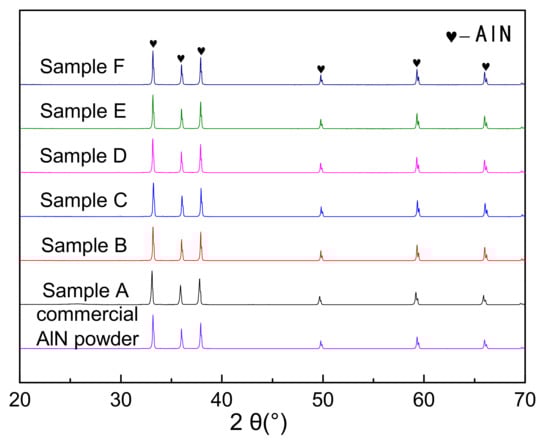Figure 5 showed the X-ray diffraction patterns of the nitridized products with different PVB additions. The commercial AlN powder (Tokuyama) was also identified as a contrast. The nitridized products displayed the same peaks of AlN regardless of the PVB amounts, indicating that the raw powders were completely nitridized when the PVB weight ratio in Al(OH)3 and carbon black were in the range of 0–0.1. The HWHM (half width at half maximum) values at the highest peaks of the CRN AlN (samples A–F) were 0.158°, 0.146°, 0.150°, 0.152°, 0.146° and 0.146° respectively, which were similar to the commercial AlN powder (0.152°). Combining Figure 3, it was deduced that there was still sufficient nitrogen gas around the raw material powder to ensure the complete nitridation of alumina even though the tap density reached 0.71 g/cm3 (sample F).