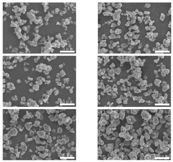 Figure 6 showed the morphologies of the nitridized powders of samples A–F. It could be seen that the agglomeration of the AlN powder was obvious in the sample without PVB addition (Figure 6a). With the addition of PVB, the particle distribution of the nitridized powders became better and better. However, when the PVB addition was above 8 wt.%, the agglomeration became serious again (Figure 6e,f). The agglomeration change of the CRN products was consistent with that of the unreacted mixed samples (Figure 4).