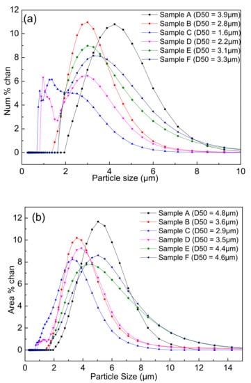 Figure 7. Particle size distributions of the nitridized powders with different PVB additions: (a) number distribution; and (b) area distribution.
