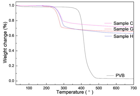 Table 2. The weight change (wt.%) of the single PVB, samples G, H and C at different temperature ranges.