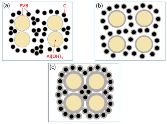 Figure 10. Sketch map of Al(OH)3/carbon black mixture covered with PVB layer: (a) thin PVB layer; (b) moderate PVB layer; and (c) thick PVB layer.