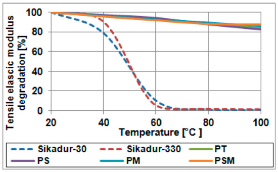 The tensile elastic modulus degradation in elevated temperatures (compare—Table 4).