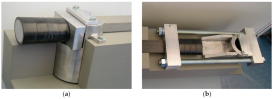 Schwegler and Breset propose a ‘StressHead’ system to enable anchoring strips prestressed up to the force of 220 kN each (laminate deformation of 9.5‰) [45]. A special reinforced polymer head is made at the end of the laminate. It has a length of 110 mm and an elliptical cross section 80 mm × 60 mm in axial dimensions. StressHeads are fixed on massive steel anchorages fastened to the reinforced concrete structure by Ø100 mm steel pin. Figure 2a shows a model of a passive (fixed) anchorage, and Figure 2b shows a model of an active (moveable) anchorage of the strip. Either adhesive bonded or unbonded strips are applicable in this prestressing system.