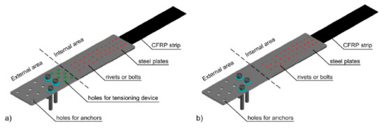 The crucial aspect of strengthening reinforced structures with externally bonded FRP is the peeling-off mechanism. The concentration of shear and normal stresses follows at the ends of the laminate bonded to the concrete surface. As a result, material detachment occurs. To prevent this type of failure mechanism in the case of pre-tensioned FRP laminate, several methods of strip anchoring have been developed so far [43,44], which include both ideas with gradual reduction of prestressing force along the length of the strip and those using mechanical anchoring.