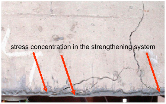 Repair and/or strengthening damaged concrete elements using FRP composites while ensuring simultaneously enough safety margin of the strengthened structure is a difficult task. When the structure is strengthened by CFRP laminates bonded on stiff adhesive layers made of epoxy resins, the advantages of CFRP materials are not fully utilised because of the low tensile and shear surface strength of the concrete element’s surface. Shear and normal interfacial stress peaks in the stiff bond system (concrete–epoxy) occur at the end of CFRP laminates or in discontinuous areas such as the crack regions. Local stress concentrations in the adhesive layer, and subsequently in the FRP laminate, are arising at the locations of cracks in the concrete element. In the case of rigid, relatively brittle, epoxy adhesives, even small stress concentrations can cause cracking, while soft polymeric adhesives have the ability to redistribute these stress concentrations and bridge the crack. The notch effect that appears after cracking of the RC element in both the adhesive layer and laminate is shown in Figure 6.