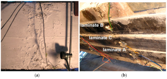 The main breakage (crack pattern) of the beam and the crushed compression zone were repaired by injection using epoxy resin Sikadur 52 (Figure 8a). Next, the beam was strengthened by three CFRP S512 laminates at the bottom surface of the beam. Two of them, outermost, were bonded on the stiff adhesive layer made of epoxy resin Sikadur 30 (compare Table 3). Those laminates are presented as laminates A and B in Figure 8b (and in further analysis marked as A/S30 and B/S30). The third CFRP laminate (inner) was bonded on the very flexible adhesive layer made of very soft polymer, named PXBM (laminate C in Figure 8b, marked also as C/PXBM). The mechanical properties of the adhesive layer made of polymer PXBM are tensile elastic modulus E = 0.3 MPa and ultimate strain ε = 1000%. In order to protect the one end of CFRP laminates against delaminating, the band made of CFRP sheet was installed on one side of the beam.