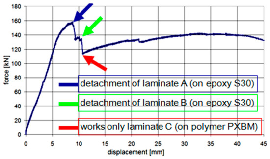 After these tests, the main static test up to the failure was carried out with the displacement rate of 1 mm/min (displacement of the actuator jack). In the first phase of load, all CFRP laminates worked up to the maximum external force of 158.1 kN when the first of the side laminates (marked as A) was detached. Consequently, eccentric distribution of internal forces occurred and soon afterwards the second side laminate (B) also detached. The obtained relationship force–displacement is presented in Figure 9.