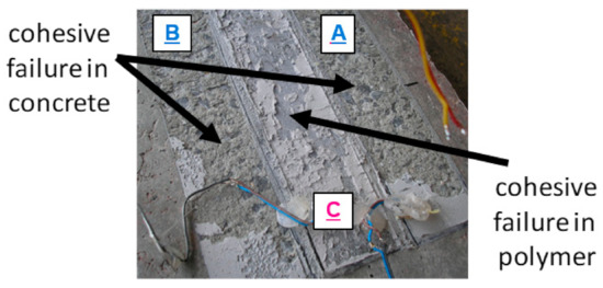 The bottom of the tested beam after the laminate detachment: side laminates (A and B)—brittle failure in concrete, middle laminate (C)—ductile failure in the adhesive layer.