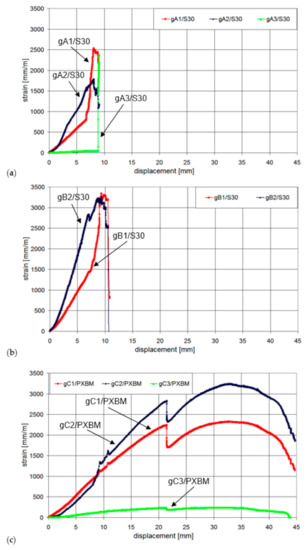 The calculated ratio between the deformation energy value (calculated as an area under the force–displacement graph) obtained after the detachment of the laminates A and B (5120 J) and the work value up to the failure of the laminate A (823 J) is 6.22. This high deformation energy reserve in the post-critical state gives a high increase in structural safety. The laminates A and B were not showing any slip of their ends up to the laminates’ detachment, whereas the laminate C showed the slip of value 2 mm just before the failure moment of the laminate A—see Figure 11. The slip increased only up to the value of 2.8 mm and the slip gradient increase of the laminate C started to be higher, when the laminate B detached. The laminate C was able to carry the load up to the force of 142 kN, and next, a very slow process of delamination started in the polymer adhesive layer, with almost constant force and without damage of concrete—see Figure 10. The end of the C plot at the value of 7.5 mm (Figure 11) was caused by the limit of the linear variable displacement transducer LVDT sensor. Even partial crushing of the compression concrete zone (at displacement equal 22 mm) did not cause any significant force to drop and significant deflection increase of the beam (Figure 9). It caused only a temporary pause of the slip increase (Figure 11) and temporary reduction of strain in the laminate C (Figure 12—the strain history at points gA2, gB2, and gC2), because of stress redistribution.