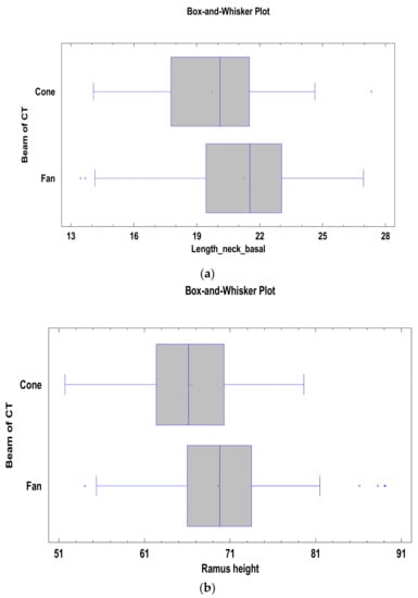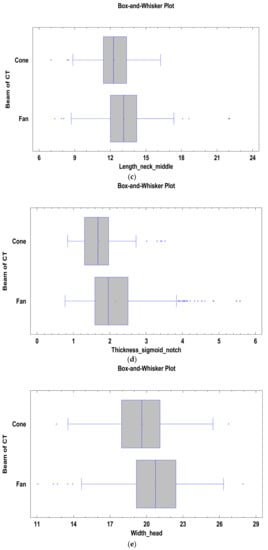 Among the measurements analyzed (Table 2) with the Kruskal–Wallis test, the distance_sigmoidnotch-necktop measurement did not show statistically significant differences between the models generated on the basis of cone-beam tomography and fan-beam tomography. Statistically significant differences between the two types of tomography were obtained for the length_neck_top, width_neck_basal, and thickness_sigmoid_notch measurements (p < 0.05).