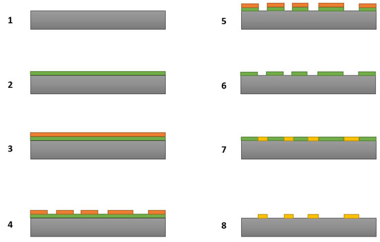 We employed maskless lithography to transfer different types of microstructures onto silicon substrates. A benefit of this type of lithography is that it allows users to transfer complex patterns onto the substrates without the use of physical masks. Figure 1 shows in detail all the steps involved in the fabrication of the B50C2 microstructures. The first step is the creation of a mask on the substrate. The requirement here is that the mask should survive the harsh CVD plasma environment in which the B-C microstructures will be grown. Tungsten was deliberately chosen for the mask material. As we have shown in our previous works [17,18], tungsten survives well in the harsh CVD plasma conditions. After depositing a tungsten thin film, the substrate was then transferred to the maskless photolithography system where our desired pattern was then “printed” on the substrate. A positive tone photoresist (Microposit SC1827) and AZ-300 developer were used in the lithography process. By etching selected areas of the tungsten mask, we exposed silicon where the B-C compound could be grown. A commercially available chemical etchant (product #667498, Sigma-Aldrich, St. Louis, MO, USA) was used for dissolving tungsten masks after necessary steps were performed in our experiments. After CVD processing of the substrate, a second round of wet etching removed the remaining tungsten mask to reveal as grown B-C microstructures. An even more detailed explanation for the lithography process and how we employed it in different application areas can be found in our previous publications [17,18].