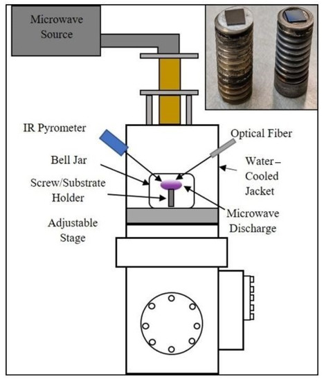Boron-rich boron carbide coatings were grown in a microwave plasma chemical vapor deposition (MPCVD) system (Wavemat Inc. Plymouth, MI, USA) shown in Figure 2. The sample surface is heated by direct contact with the plasma. The substrate holder and the outer resonance cavity jacket on the MPCVD reactor are water-cooled. A quartz bell jar isolates the low-pressure plasma environment from the resonance cavity. N-type <100> orientation silicon substrates with the desired lithographic pattern were placed on the surface of a 0.5” diameter molybdenum screw (Figure 2). Microwave power of 1 kW was used for growth experiments. Chamber pressure was 15 Torr during the deposition process. Hydrogen (H2) was used as the carrier gas and a diborane mixture (90% H2, 5% B2H6, with 5 ppm methane in B2H6 gas acting as the source of carbon) as the reactive gas. The gas flow rates were 500 standard cubic centimeters per minute (SCCM) of hydrogen and 2 SCCM of the diborane mixture. Total deposition time was 6 h with an average substrate temperature of 800 °C.