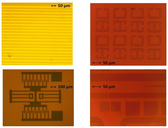 Various designs transferred onto the tungsten mask on silicon substrates. These images correspond to step 6 in Figure 1.