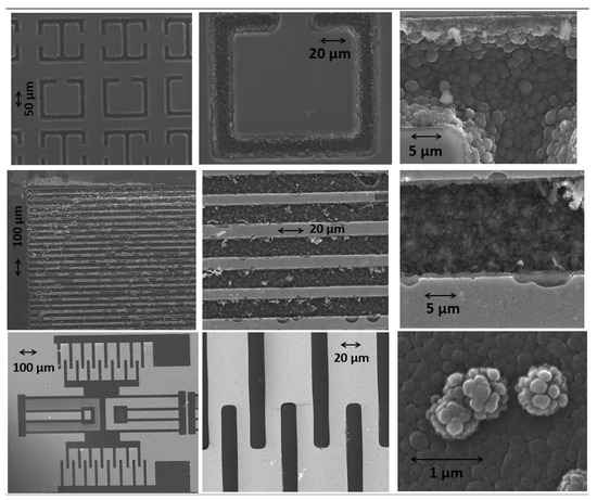 SEM images of B-C microstructures grown on silicon substrates. The shapes in the top row are inspired by radio frequency (RF) ring resonator structures. The middle row shows a densely packed grid of B-C microstructures with a gap of 10 microns between the lines. The bottom row shows B-C microstructures in the geometry of a MEMS resonator.