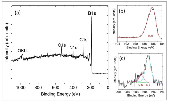 X-ray photoelectron spectroscopy survey scans of (a) the B-C microstructure with an elemental composition of 80.6% B, 12.4% C, 3.8% of N and 3.2% O. Panels (b,c) show high-resolution scans for B1s and C1s, respectively, with corresponding peaks assigned to B-C, C-B and C-C (adventitious carbon) bonding.