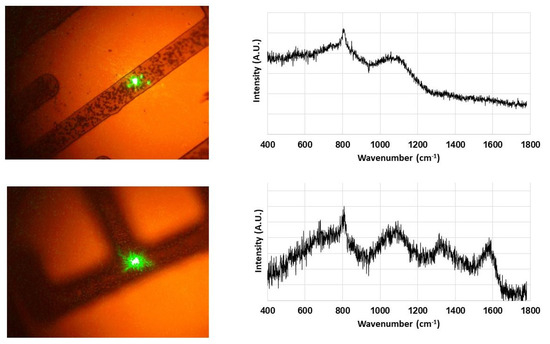 Raman spectroscopy was performed on these B-C microstructures. The results shown in Figure 6 are again in good agreement with our previous results [3,4]. The 532 nm laser used for spectroscopic studies was carefully positioned on the grown B-C microstructures as shown in Figure 6. The characteristic broad peaks indicating the presence of amorphous structures were observed from the sample in the top row of Figure 6. These are the bands centered around 800 cm−1 and 1100 cm−1 which have been attributed to the B4C structural framework [21]. In addition to these two bands, the two broad bands centered around 1340 cm−1 and 1570 cm−1, commonly known as “D” and “G” bands, reveal the presence of disordered carbon (bottom row). The presence of these disordered carbon bands has also been attributed to carbon in boron carbide materials in literature [4,6,21]. Combined with the similarity in XPS results from the thin-film counterparts of these B-C microstructures, they can indeed be characterized as B50C2.