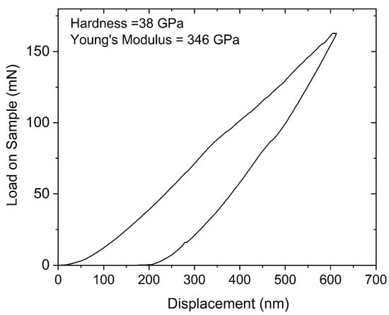 Nanoindentation load-displacement curve from one location on the boron-rich boron carbide microstructure to a depth of 600 nm. The extracted values of nanoindentation hardness and Young’s modulus are also indicated.