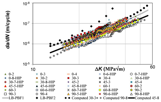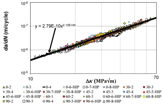 Hartman–Schijve representation of the thirty SLM Ti-6Al-4V tests.