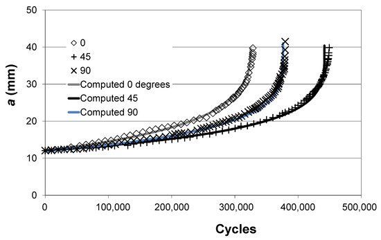 Let us next consider the R = 0.1 crack growth histories presented in [20] for crack growth in a 10 mm thick ASTM compact tension (CT) specimen with cracks at 0°, 45°, and 90° to the build direction in SLM Ti-6Al-4V. The measured and computed crack growth histories are shown in Figure 3 where we see excellent agreement. The values of ΔKthr and A used in Figure 3 are given in Table 4.