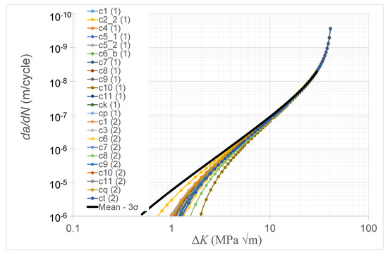 The values of ΔKthr and A used in Figure 2, and the corresponding values of the coefficient of determination (R2) are given in Table 2. (The mean value of the coefficients of determination given in Table 2 is approximately 0.96.) Here, it should be recalled that as shown in [13] the ASTM definition of the fracture toughness (ΔKth), which is arbitrarily chosen to be the value of ΔK at a crack growth rate da/dN of 10−10 m/cycle [19], is related to ΔKthr is via the expression: