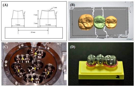 (A) Design of standard three-unit fixed dental prostheses (FDP), (B) designed FDP, and (C) sequentially milled Ti FDP on Computer Aided Design/Computer Aided Manufacturing (CAD/CAM). The numbers indicate the milling sequence. (D) Seated on FDP die with light-body silicone.