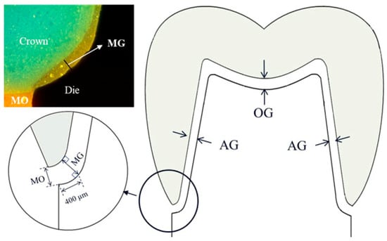 The fitting accuracy of the fabricated Ti FDPs on the two abutments was evaluated by a silicone replica technique using light-body and regular-body silicones []. The FDPs were seated with light-body polyvinyl siloxane (PVS, Smartsil, Seilglobal, Busan, Korea) on the corresponding dies under a constant loading of 50 N (A-001, MECC) to standardize the process (Figure 1D) []. After removal of FDP, the silicone film placed at the inner gap was fixed by pouring regular-body PVS (Charmflex, Denkist, Gunpo, Korea). The combined silicone replicas were cut mesiodistally to measure gap dimensions along with the deepest occlusal point. A wide variation in definition and terminology has been presented to evaluate the fitting accuracy of cast or CAD/CAM fixed prostheses [,,,]. Among those, this study measured the gap dimensions at four different locations: MO (marginal opening), MG (marginal gap), AG (axial gap), and OG (occlusal gap), which were applied from the study of Beuer et al. with a modification in the nomenclature (Figure 2) []. However, MG was measured vertically at the maximum concavity point of the inner margin for measuring consistency, which is approximately 0.4 mm distant from the MO location.