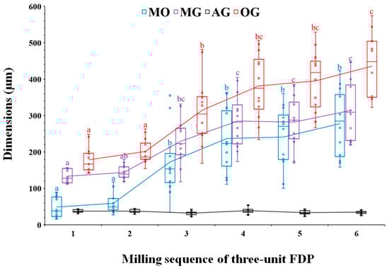 Box plot for marginal opening and gap dimensions of Ti-6Al-4V three-unit fixed dental prostheses (FDPs) according to the milling sequence. The same letters at each location indicate no statistical significance between the milling sequences at p < 0.05.