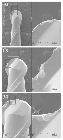 The detailed reproduction of the crown intaglio surface by milling can be affected by the smallest bur diameter among the set of cutting tools, which must be considered in abutment preparation [,]. Furthermore, machining damage of cutting tools results in a reduction in tool diameter and a change in cutting-edge radius, as shown in Figure 5. Thus, machining hard materials, such as titanium and other dental base metal alloys, can easily cause bur wear and adaptation inaccuracy of milled prostheses [,]. A previous study demonstrated that, for fabrication of Co-Cr fixed prostheses, the milling method produced a relatively higher inaccurate internal fit than milled-wax casting or laser sintering techniques, indicating the influence of bur wearing []. Thus, the machinability of milled material can significantly influence the fitting accuracy of prostheses fabricated by dental CAD/CAM. However, the machinability is a multifactorial parameter [,].